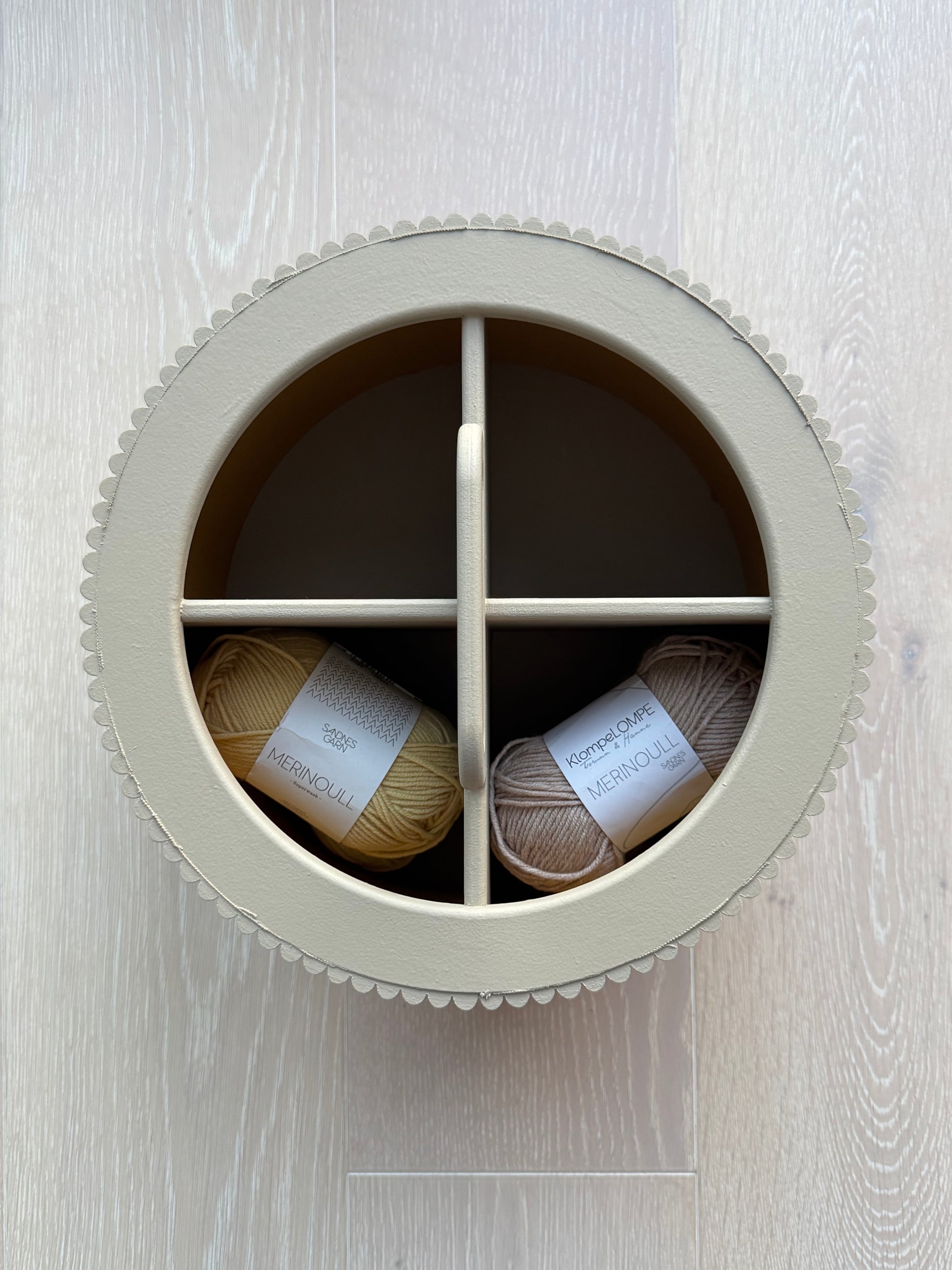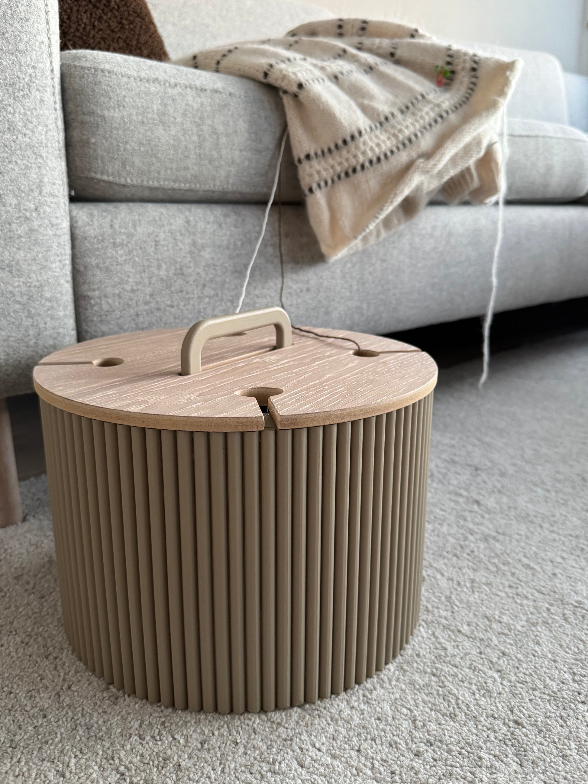 Hold garnet ryddig og flokefritt med vår håndlagde garnboks. Strikk direkte fra boksen uten at tråden floker seg, enten du bruker ett eller flere nøster. Lokket har smarte åpninger som gjør strikkingen enkel og praktisk.